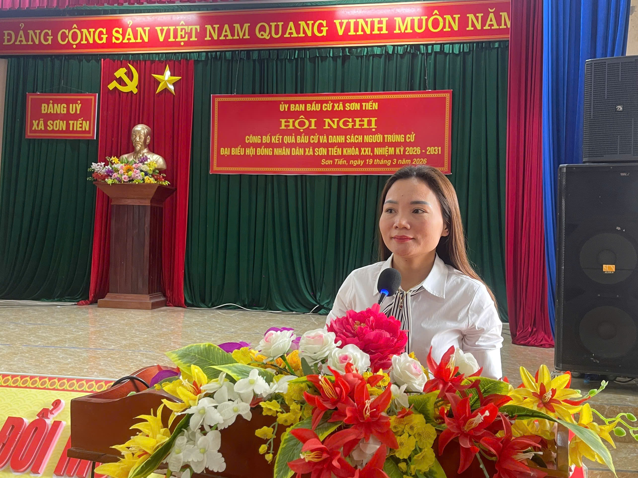 Tại hội nghị, thay mặt Ủy ban bầu cử, bà Nguyễn Thị Thu Hiền - Phó Chủ tịch TT Ủy ban bầu cử xã đã Thông qua Nghị quyết công bố kết quả bầu cử và danh sách những người trúng cử Đại biểu HĐND xã Sơn Tiến khóa XXI nhiệm kỳ 2026-2031
