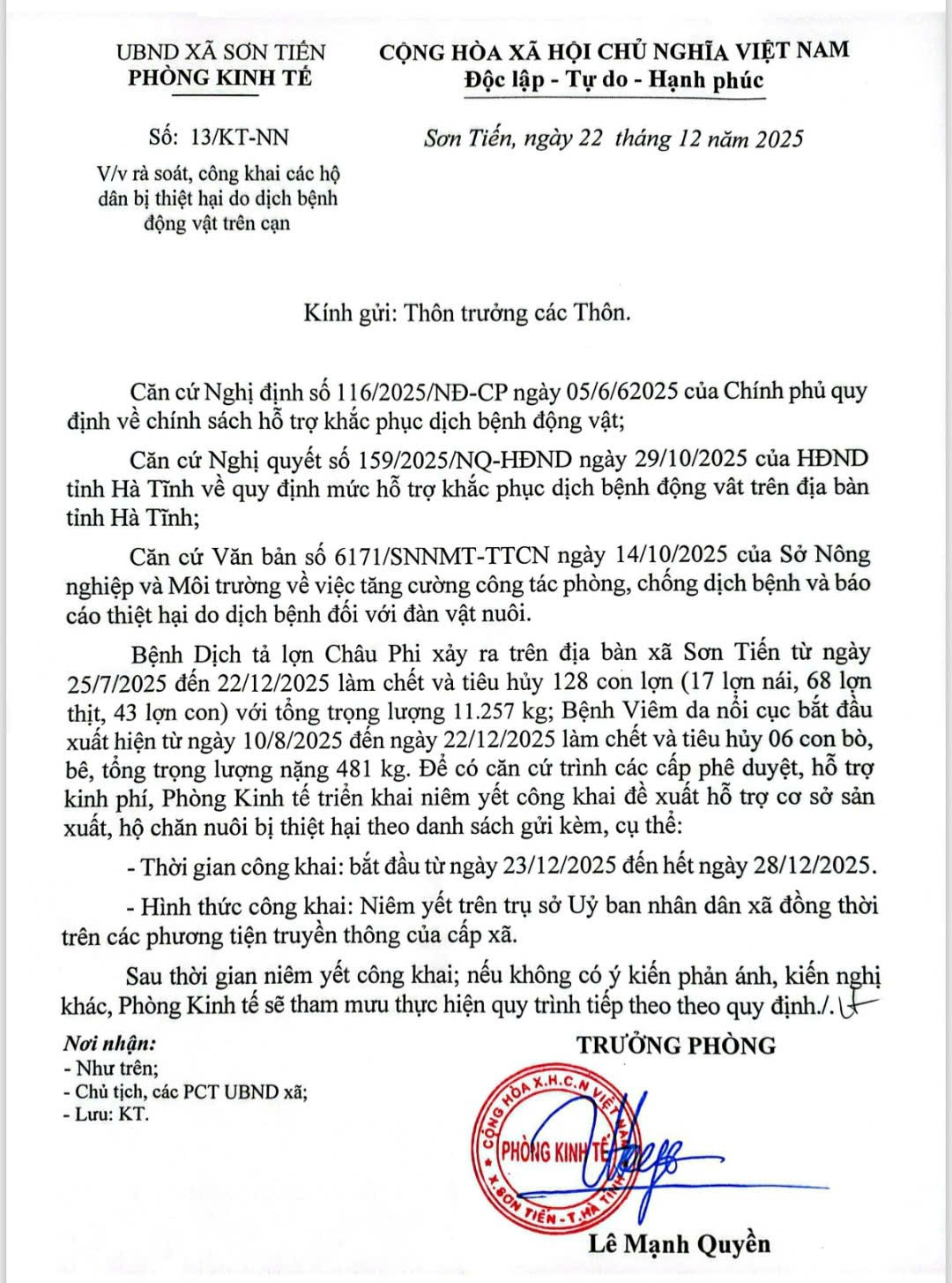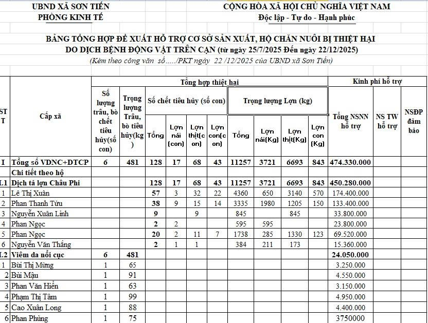 THÔNG BÁO RÀ SOÁT, CÔNG KHAI CÁC HỘ DÂN BỊ THIỆT HẠI DO DỊCH BỆNH ĐỘNG VẬT TRÊN CẠNBBT23/12/2025A -A+BBT23/12/2025A -A+ File đính kèmVB niêm yết công khai _1.pdfSơn Tiến.Bảng tổng hợp đề xuất thiệt hại mẫu số 3a.xlsx