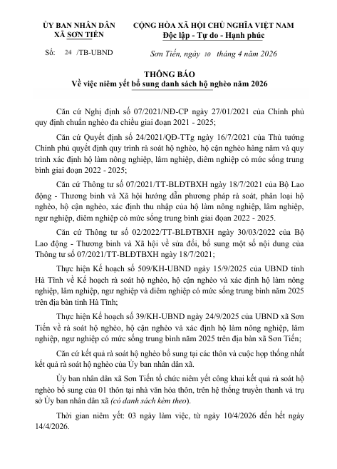 THÔNG BÁO Về việc niêm yết bổ sung danh sách hộ nghèo năm 2026BBT10/04/2026A -A+BBT10/04/2026A -A+ File đính kèmTHONG-BAO-NIEM-YET-DS-HO-NGHEO-THUONG-XUYEN-10.4.2026_longpxsontien-10-04-2026_10h09p18(10.04.2026_10h49p02)_signed.pdfds-niem-yet-cong-khai_xsontien-10-04-2026_10h49p10(10.04.2026_10h49p19)_signed.pdf